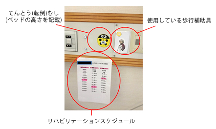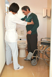 例えば、歩行補助具や車いすの種類、ベッドの高さ、テレビの向き、手すりの有無など些細なことですが、快適に生活できる工夫をいたします。さらに、リハビリで痛みや麻痺の状態を確認し、トイレ、入浴の方法を看護師・介護士と相談して決定します。